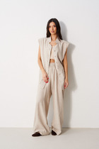 Этот 2-х предметный комплект состоит из жакета и брюк.  Жакет - настоящая жечужина в гардеробе.  Небанальный вариант застёжки сбоку на лицевой стороне, и потайной пуговицей внутри  изделия придаёт жакету характер, подчёркивает силуэт и линию талии. Жакет выгодно акцентирует фигуру, создавая утончённый и женственный образ. Благодаря декоративным рюшам из вуали, он легко станет центральным элементом образа. Карманы с клапанами. Брюки станут глотком свежего воздуха среди широких силуэтов и брюк палаццо. Их облегающий крой подчёркивает линию бедёр и тали, а затем изящно расклешается от колена.Такой фасон позволит скорректировать фигуру и подойдёт для строго дресс кода. Вертикальные линии по центру брючин вытягивают силуэт и удлиняют ноги. Застёжка классическая - молния и пуговица в цвет изделия.