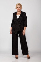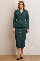 Этот 2-х предметный комплект состоит из жакета и брюк.  Жакет - настоящая жечужина в гардеробе.  Небанальный вариант застёжки сбоку на лицевой стороне, и потайной пуговицей внутри  изделия придаёт жакету характер, подчёркивает силуэт и линию талии. Жакет выгодно акцентирует фигуру, создавая утончённый и женственный образ. Благодаря декоративным рюшам из вуали, он легко станет центральным элементом образа. Карманы с клапанами. Брюки станут глотком свежего воздуха среди широких силуэтов и брюк палаццо. Их облегающий крой подчёркивает линию бедёр и тали, а затем изящно расклешается от колена.Такой фасон позволит скорректировать фигуру и подойдёт для строго дресс кода. Вертикальные линии по центру брючин вытягивают силуэт и удлиняют ноги. Застёжка классическая - молния и пуговица в цвет изделия.