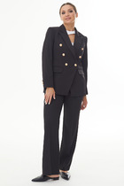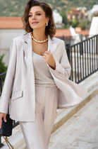 Этот 3-х предметный комплект состоит из жакета, корсетного топа и брюк.   Жакет без подкладки, швы обработаны кантом в цвет изделия. Рукав втачной, прямой, одношовный. Воротник шаль. Застежка на притачной пояс, дополнен съёмной пряжкой золотистого цвета.   Корсетный топ с открытыми плечами — воплощение чувственной элегантности. Открытые плечи подчеркивают линию шеи и ключиц, а корсетный крой создает безупречный силуэт. Роскошный силуэт и акцентная баска делают его идеальным выбором для особенного вечера. Также топ отлично вписывается в повседневные образы.   Брюки станут глотком свежего воздуха среди широких силуэтов и брюк палаццо. Их облегающий крой подчёркивает линию бедёр и тали, а затем изящно расклешается от колена.Такой фасон позволит скорректировать фигуру и подойдёт для строго дресс кода. Вертикальные линии по центру брючин вытягивают силуэт и удлиняют ноги. Застёжка классическая - молния и пуговица в цвет изделия.