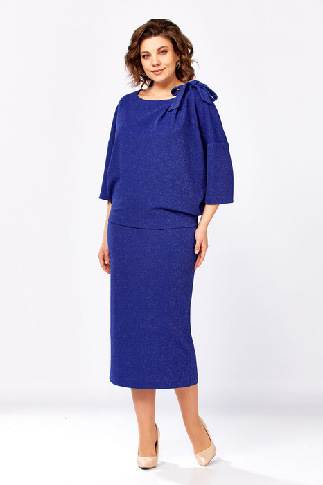 Комплект женский, трикотажный с лёгким блеском, состоящий из джемпера и юбки. Джемпер свободного покроя с углублённой проймой и 3/4 рукавом, вырез горловины "лодочка", по горловине ассиметрично слева- драптровка и бант. Юбка прямая, слегка зауженная к низу, на подкладке, по поясу с эластичной тесьмой.