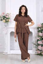 Комплект женский, состоящий из блузки и юбки, комбинированные из хлопковой однотонной ткани и ткани с вышивкой в тон. Блузка прямого силуэта с рубашечным воротником и планкой с пуговицами, рукав короткий с манжетой по низу, по переду и спинке кокетки, низ изделия фигурный. Юбка расширенная к низу, на подкладке из х/б ткани однотонной, с воланами, по поясу эластичная тесьма.