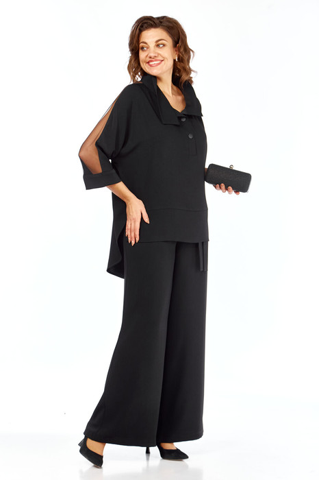 Женский двухпредметный костюм состоит из свободной блузы и широких брюк,выполнен из однотонной плательно-костюмной ткани.