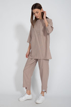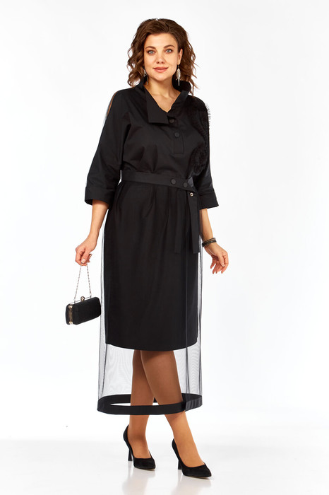 Платье прямого силуэта , "оверсайз", с цельнокроеным рукавом длиной 3/4, заканчивающимся притачной отложной манжетой, выполнено из двух видов ткани. Перед с втачными планками по горловине и центральной застёжкой на 2 кнопки, и декоративным элементом из сетки. Воротник - стойка. Спинка с отрезной кокеткой из сетки и средним швом. В боковых швах разрезы.