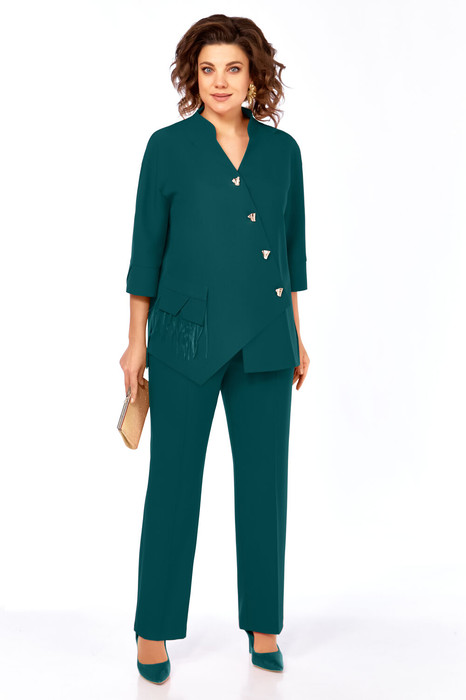 Женский двухпредметный нарядный костюм состоит из асимметричного жакета и брюк, выполненных из однотонной плательно-костюмной ткани.
