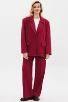 Жакет прямого силуэта, с центральной застежкой на 3 петли и пуговицы и воротником пиджачного типа с отложными лацканами из костюмной ткани . Перед с вертикальными рельефами и  карманами с листочками. Рукава втачные двухшовные с отложными манжетами с разрезом. Жакет с плечевыми накладками,без подкладки.