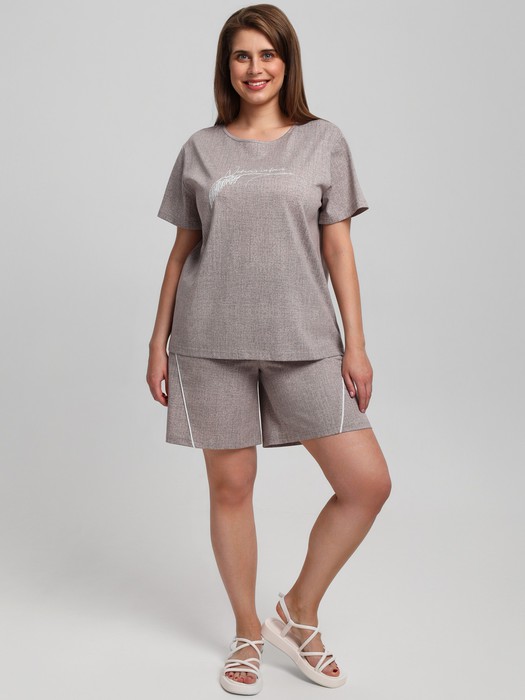 Костюм женский из трикотажного полотна «кулирка» с набивным рисунком, состоящий Футболка – из полотна с набивным рисунком, свободного покроя, с короткими втачными рукавами, горловиной овальной формы, окантованной основным материалом. На полочке выполнена вышивка.Шорты - из полотна с набивным рисунком, свободные, с карманами в боковых швах, на притачном поясе с эластичной тесьмой внутри. Детали передних половин разрезаны по косой, в шве соединения кант контрастного цвета.