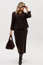 Комплект 2-х предметный состоит из жакета и брюк. Жакет женский удлиненный, полуприлегающего силуэта с центральной бортовой застежкой на пуговицы до линии перегиба лацкана. Спереди рельефные швы от плечевого шва, отрезной бочок и карман с клапаном. Спинка с рельефами от плечевого шва. Рукав втачной, двухшовный. Воротник пиджачного типа. Жакет на подкладке. Длина рукава 61,5 см, длина по спинке 70 см. Классические брюки, прямые, слегка заужены к низу, по переду обработаны карманы с отрезным бочком, застежка на тесьму-молнию и 1 пуговицу. На задних половинках обработаны вытачки и имитация карманов в рамку с двумя обтачками, пояс в брюках притачной. По низу брюк в боковом шве есть небольшой разрез. Длина брюк от талии по боковому шву 97 см