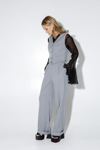 Комплект 2-х предметный из хлопковой ткани, состоит из жакета и и брюк. Жакет женский удлиненный, полуприлегающего силуэта с центральной бортовой застежкой на пуговицы до линии перегиба лацкана. Спереди рельефные швы от плечевого шва, отрезной бочок и карман с клапаном. Спинка с рельефами от плечевого шва. Рукав втачной, двухшовный, 3/4, с небольшим разрезом в локтевом шве. Воротник пиджачного типа. Перед жакета на подкладке. Длина рукава 50, длина по спинке 68 см.Брюки прямые, классические, с заутюженными стрелками, по переду обработаны карманы с отрезным бочком, застежка на тесьму-молнию и 1 пуговицу. На задних половинках обработаны вытачки и имитация карманов с листочкой, пояс в брюках притачной. Длина брюк от талии по боковому шву 103 см.