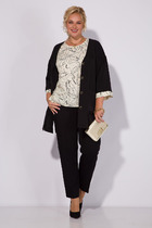 Комплект женский, 2-х предметный, состоит из жакета и и брюк. Жакет женский удлиненный, из текстильной ткани, на подкладке, полуприлегающего силуэта с центральной бортовой застежкой на пуговицы до линии перегиба лацкана. Спереди рельефные швы от плечевого шва, отрезной бочок и карман с клапаном. Спинка с рельефами от плечевого шва. Рукав втачной, двухшовный, по низу рукава обработана шлица на петли-пуговицы. Воротник пиджачного типа. Длина по спинке 66 см, длина рукава 62 см.Брюки прямые,классические, с заутюженными стрелками,по переду обработаны карманы с отрезным бочком,застежка на тесьму-молнию и 1 пуговицу.На задних половинках обработаны вытачки и имитация карманов с листочкой, пояс в брюках притачной. Длина брюк от талии по боковому шву 100 см.