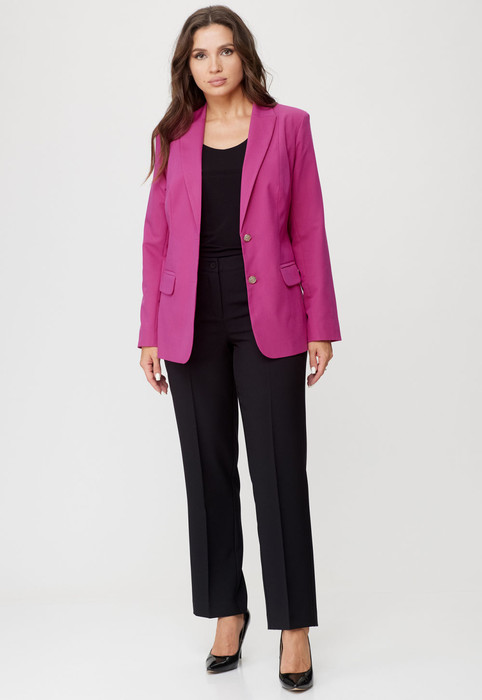 Комплект женский, 2-х предметный, состоит из жакета и и брюк. Жакет женский удлиненный, из текстильной ткани, на подкладке, полуприлегающего силуэта с центральной бортовой застежкой на пуговицы до линии перегиба лацкана. Спереди рельефные швы от плечевого шва, отрезной бочок и карман с клапаном. Спинка с рельефами от плечевого шва. Рукав втачной, двухшовный, по низу рукава обработана шлица на петли-пуговицы. Воротник пиджачного типа. Длина по спинке 66 см, длина рукава 62 см.Брюки прямые,классические, с заутюженными стрелками,по переду обработаны карманы с отрезным бочком,застежка на тесьму-молнию и 1 пуговицу.На задних половинках обработаны вытачки и имитация карманов с листочкой, пояс в брюках притачной. Длина брюк от талии по боковому шву 100 см.