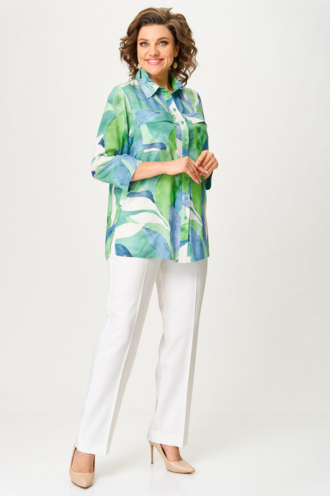 Комплект 2-х предметный состоит из блузы и и брюк. Блуза женская, прямого силуэта из текстильной ткани. Воротник отложной, застежка центральная на петли-пуговицы. По переду нагрудные вытачки и настрочены накладные карманы. Спинка цельная. Рукав втачной, одношовный, 3/4, с притачной манжетой. В боковых швах по низу небольшие разрезы. Длина по спинке 74 см, длина рукава 45. Брюки классические,из текстильной ткани, прямые, слегка заужены к низу,заутюжены стрелки,по переду обработаны карманы с отрезным бочком,застежка на тесьму-молнию и 1 пуговицу.На задних половинках обработаны вытачки и имитация карманов с листочкой, пояс в брюках притачной. Длина брюк от талии по боковому шву 105 см.