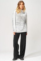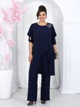 Комплект женский-двойка, из текстильной ткани, жакет удлиненный, полуприлегающего силуэта с центральной бортовой застежкой на пуговицы до линии перегиба лацкана. Спереди рельефные швы от плечевого шва, отрезной бочок и карман с клапаном. Спинка с рельефами от плечевого шва. Рукав втачной, двухшовный. Воротник пиджачного типа. Жакет на подкладке, длина по спинке 67 см, длина рукава 62 см. Брюки прямые, классические, с заутюженными стрелками, по переду обработаны карманы с отрезным бочком, застежка на тесьму-молнию и 1 пуговицу. На задних половинках обработаны вытачки и имитация карманов с листочкой, пояс в брюках притачной, сбоку на резинке. Длина брюк от талии по боковому шву 103 см.