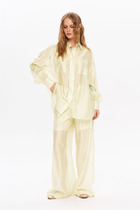 Комплект женский-двойка, из текстильной ткани, жакет удлиненный, полуприлегающего силуэта с центральной бортовой застежкой на пуговицы до линии перегиба лацкана. Спереди рельефные швы от плечевого шва, отрезной бочок и карман с клапаном. Спинка с рельефами от плечевого шва. Рукав втачной, двухшовный. Воротник пиджачного типа. Жакет на подкладке, длина по спинке 67 см, длина рукава 62 см. Брюки прямые, классические, с заутюженными стрелками, по переду обработаны карманы с отрезным бочком, застежка на тесьму-молнию и 1 пуговицу. На задних половинках обработаны вытачки и имитация карманов с листочкой, пояс в брюках притачной, по боковому на резинке. Длина брюк от талии по боковому шву 103 см.