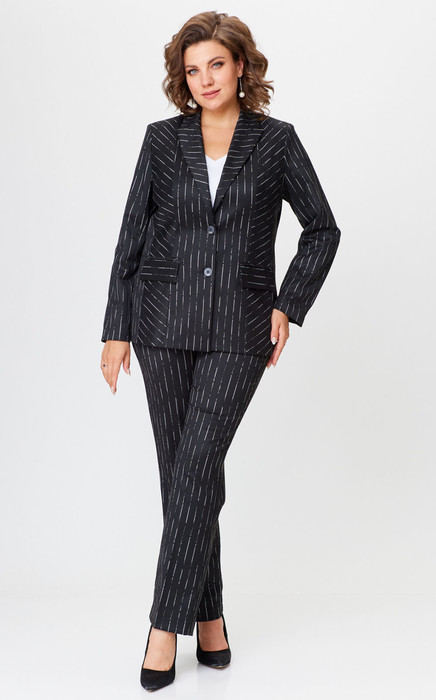 Комплект женский-двойка, из текстильной ткани, жакет удлиненный, полуприлегающего силуэта с центральной бортовой застежкой на пуговицы до линии перегиба лацкана. Спереди рельефные швы от плечевого шва, отрезной бочок и карман с клапаном. Спинка с рельефами от плечевого шва. Рукав втачной, двухшовный. Воротник пиджачного типа. Жакет на подкладке, длина по спинке 67 см, длина рукава 62 см. Брюки прямые, классические, с заутюженными стрелками, по переду обработаны карманы с отрезным бочком, застежка на тесьму-молнию и 1 пуговицу. На задних половинках обработаны вытачки и имитация карманов с листочкой, пояс в брюках притачной. Длина брюк от талии по боковому шву 103 см.