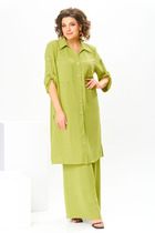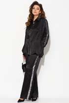 Комплект женский-двойка, из текстильной ткани, жакет удлиненный, полуприлегающего силуэта с центральной бортовой застежкой на пуговицы до линии перегиба лацкана. Спереди рельефные швы от плечевого шва, отрезной бочок и карман с клапаном. Спинка с рельефами от плечевого шва. Рукав втачной, двухшовный. Воротник пиджачного типа. Жакет на подкладке, длина по спинке 66 см, длина рукава 62 см. Брюки прямые, классические, с заутюженными стрелками, по переду обработаны карманы с отрезным бочком, застежка на тесьму-молнию и 1 пуговицу. На задних половинках обработаны вытачки и имитация карманов с листочкой, пояс в брюках притачной. Длина брюк от талии по боковому шву 103 см.