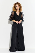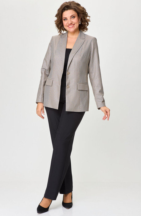 Комплект женский-двойка, из текстильной ткани, жакет удлиненный, полуприлегающего силуэта с центральной бортовой застежкой на пуговицы до линии перегиба лацкана. Спереди рельефные швы от плечевого шва, отрезной бочок и карман с клапаном. Спинка с рельефами от плечевого шва. Рукав втачной, двухшовный. Воротник пиджачного типа. Жакет на подкладке, длина по спинке 67 см, длина рукава 62 см. Брюки прямые, классические, с заутюженными стрелками, по переду обработаны карманы с отрезным бочком, застежка на тесьму-молнию и 1 пуговицу. На задних половинках обработаны вытачки и имитация карманов с листочкой, пояс в брюках притачной. Длина брюк от талии по боковому шву 103 см.