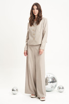 Комплект 2-х предметный из хлопковой ткани, состоит из жакета и и брюк. Жакет женский удлиненный, полуприлегающего силуэта с центральной бортовой застежкой на пуговицы до линии перегиба лацкана. Спереди рельефные швы от плечевого шва, отрезной бочок и карман с клапаном. Спинка с рельефами от плечевого шва. Рукав втачной, двухшовный, 3/4, с небольшим разрезом в локтевом шве. Воротник пиджачного типа. Перед жакета на подкладке. Длина рукава 50, длина по спинке 68 см. Брюки-палаццо, средней ширины, выполнены с карманами с отрезным бочком в боковом шве. Пояс притачной, по боковым швам резинка, застёжка на молнию. По задним половинкам обработаны вытачки. Длина по боковому шву 108 см.