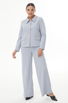 Комплект женский-двойка,из костюмной ткани, жакет удлиненный, свободного силуэта с центральной бортовой застежкой на пуговицы до линии перегиба лацкана. По переду имеется отрезной бочок и вертикальные вытачки. С прорезными карманами с клапаном и двумя обтачками. Спинка цельная. Воротник пиджачного типа. Рукав двухшовный, втачной. Жакет на подкладке. Длина рукава 63 см, длина по спинке 75 см. Брюки-палаццо,средней ширины, выполнены с карманами с отрезным бочком в боковом шве. Пояс притачной, застёжка на молнию. По задним половинкам обработаны вытачки. Длина по боковому шву 108 см.
