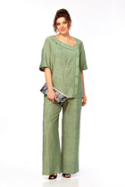 Костюм женский, 2-х предметный, состоит из жакета и брюк. Выполнен из хлопковой ткани. Жакет женский удлиненный, силуэт свободный, с центральной бортовой застежкой на пуговицы до линии перегиба лацкана. Спереди отрезной бочок и карман с клапаном. Спинка цельная. Рукав втачной. Воротник пиджачного типа. Перед жакета на подкладке. Длина по спинке 75 см, длина брюк по боковому 102 см.