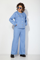 Комплект 2-х предметный состоит из жакета и и брюк. Жакет женский удлиненный, из текстильной ткани, полуприлегающего силуэта с центральной бортовой застежкой на пуговицы до линии перегиба лацкана. По переду имеется отрезной бочок и вертикальные вытачки. С прорезными карманами с клапаном и двумя обтачками. Спинка со средним швом. Воротник пиджачного типа. Рукав двухшовный, втачной. Длина рукава 63 см, длина по спинке 80 см. Брюки-палаццо из текстильной ткани. В брюках выполнены карманы с отрезным бочком в боковом шве, одна складка в районе пояса. Пояс притачной, с отделочным удлиненным поясом из текстильной ткани. Застёжка на молнию. По задним половинкам обработаны вытачки. Длина по боковому шву 105 см.