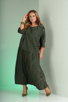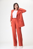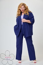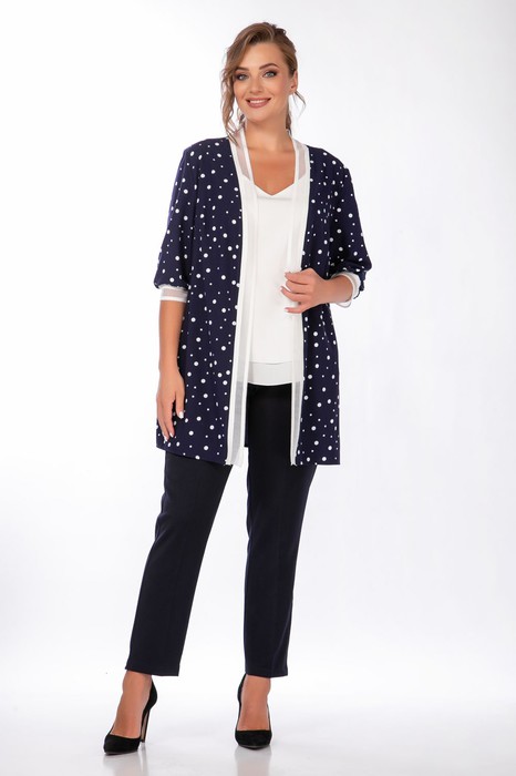 Комплект женский трехпредметный свободного силуэта, состоит из кардигана, блузона  и брюк. Кардиган без застежки, рукав втачной 3/4 с притачным довязом. Блузон двухслойный без рукава на штроких брителях. Брюки классичкские с высокой посадкой полуприлегающего силуэта, выполнены из плотной костюмной ткани с добавлением эластана. Пояс без резинки с застежкой молнией на пуговицу. В боковых швах карманы с листочкой. Длина брюк 103 см.