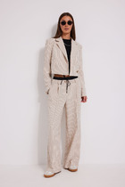 Костюм женский полуприлегающего силуэта, состоит из джемпера и брюк. Джемпер с подрезом по центру переда, с декоративным украшением, рукав втачной 3/4 с резинкой по низу, в боковых швах разрезы. Брюки с застежкой на молнию и пуговицу, в боковых швах карманы.