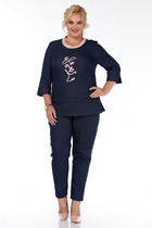 Костюм женский, полуприлегающего силуэта. Джемпер с апплекацией по переду. Рукав втачной с отрезной манжетой. Горловина обработанна трикотажным довязом. Брюки на резинке по поясу, c карманоми в боковых швах.
