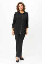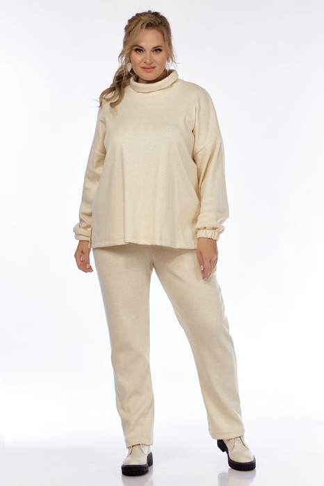 Костюм женский свободного силуэта,состоит из джемпера и брюк. Джемпер с разрезами в боковых швах, рукав длинный втачной с манжетом на резинке, воротник стойка, Брюки свободные прямые, пояс на резике, в боковых швах карманы.