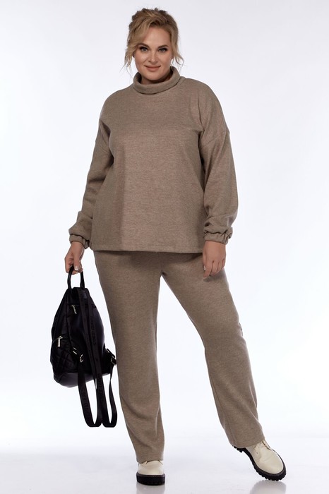 Костюм женский свободного силуэта,состоит из джемпера и брюк. Джемпер с разрезами в боковых швах, рукав длинный втачной с манжетом на резинке, воротник стойка, Брюки свободные прямые, пояс на резике, в боковых швах карманы.