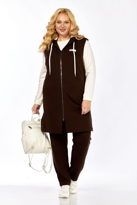 Стильный женский комплект состоит из жилета, брюк и блузы.