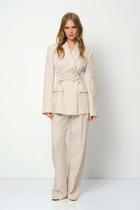 Брюки прямые, со стрелкой по переду, в боковых швах на уровне бедер наклонные карманы, верх брюк на поясе с резинкой.