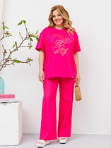 Костюм женский 2-ух предметный. Состоит из бомбера и брюк. Бомбер спортивный прямого силуэта с втачным рукавом и спущенной линией плеча, внизу рукав на манжете из довяза. Бомбер по переду с центральной застежкой на тесьму-молнию и карманами с листочкой. По горловине стойка из довяза, по низу бомбера приточная планка из довяза. По переду спинке и рукаву декоративные подрезы с вставленным в него кантом. Брюки спортивные, прямого силуэта на притачном, отстроченном поясе на резинке и втянутым в него декоративным шнуром. Над притачным поясом вставлен довяз. По переду карманы в боковых швах с наклонным входом.