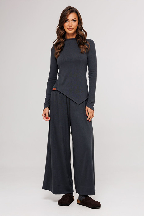 Костюм трикотажный 2-х предметный состоящий из джемпера и брюк. Джемпер полуприлегающего силуэта с втачным одношовным рукавом, низ рукава фигурный. Полочка с фигурным низом и правый боковой шов к низу слегка переходит на перед. По переду нашивка "BUTER". Горловина, расширенная с невысокой цельнокроеной стойкой. Брюки-кюлоты слегка расклешенные и укороченные к низу на притачном отстроченном поясе со втянутым в него декоративным шнурком.