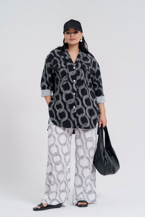 Комплект женский двухпредметный. Блузка свободного покроя из вискозной ткани. Рукава- отрезные на базе спущенного. Вырез горловины оформлен воротником пиджачного типа. На полочках накладные карманы с клапанами.  Низ асимметричный. В боковых швах разрезы. Длина спинки по среднему шву - 83 см. Длина рукава -73 см. Брюки- свободного покроя, прямые от бедра.  В боковых швах имеются карманы с отрезными бочками. Пояс отрезной с эластичной тесьмой, застежка - молния. Длина от линии талии с учетом пояса - 106 см.