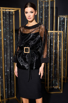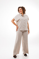 Комплект женский двухпредметный из вискозной ткани. Блузка свободного покроя с воротником пиджачного типа. Застежка- на петли с пуговицами. Рукава - втачные с расширенной линией плеча, подчеркнутой плечевыми накладками. Справа в области груди выполнен декоративный элемент в виде листочки. Длина блузы по спинке от линии горловины - 69 см., длина рукава от линии горловины - 41 см. Брюки- прямого покроя. Пояс отрезной, частично с эластичной тесьмой и застежкой на молнию и петлю с пуговицей. Есть шлевки для ремня. В боковых швах имеются карманы с отрезными бочками. Длина брюк по боковому с поясом - 107 см.
