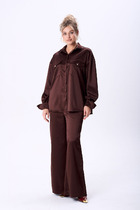 Комплект женский состоит из блузона и сарафана. Сарафан полуприлегающего силуэта, на бретелях, со средним швом на спинке, который заканчивается разрезом. По переду нагрудные вытачки, в боковых швах обработаны карманы. Блузон свободного кроя со спущенной линией плеча. Без застежки. Воротник стояче-отложной с отрезной стойкой. Внутренние срезы окантованы.