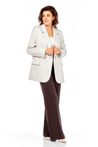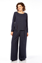 Комплект брючный состоит из блузы и брюк. Блуза полуприлегающего силуэта с центральной застежкой на петли и пуговицы. Линия плеча спущенная, воротник стояче-отложной с отрезной стойкой. По переду и спинке на линии талии -кулиса со шнуром. По боковым швам разрезы. Брюки прямые, верхний срез обработан поясом с резинкой. В бококвых швах карманы. В качсетве отделки используется шнур.
