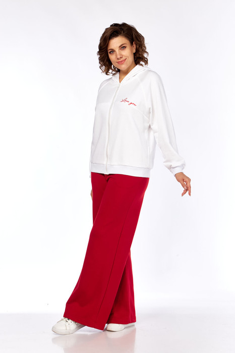 Комплект брючный.Кофта свободного кроя с центральной застежкой на тесьму-молнию. Рукав покроя реглан с притачным манжетом по низу (довяз). По переду и спинке кокетки. Капюшон со средним швом. По низу изделия отделочный пояс (довяз). В качестве отделки используется вышивка. Брюки широкие, верхний срез обработан поясом с резинкой. В боковых швах обработаны карманы.