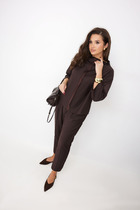Комплект женский состоит из жакета и брюк. Жакет свободного кроя с застежкоц на 2 петли и пуговицы. Перед с боковыми карманами "с листочкой". Рукав втачной, 2-шовный со спущенной линией плеча, спинка по низу чатсично на резинке. Воротник отложной с лацканами. Брюки широкие. Передние половинки брюк со складками внахлест, с боковыми карманами. Застежка спереди на молнию, передние половинки брюк с вытачками. Пояс по спинке на резинке.