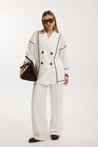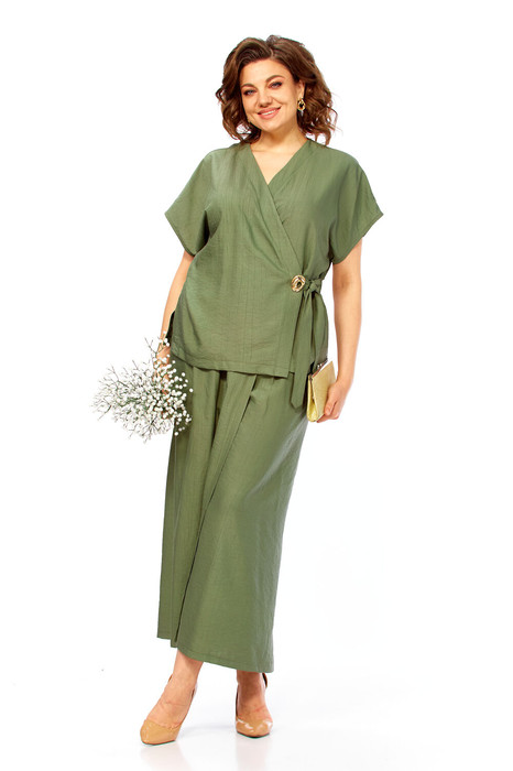 Комплект брючный состоит из блузы и брюк-кюлотов. Блуза свободного кроя с запахом, застегивается на завязки в области талии. Спинка сскулисой и резинкой по талии. В боковых швах обработаны разрезы. Проймы со спущенной линией плеча. В качестве девора брощь в области талии. Брюки-кюлоты свободного кроя с запахом спереди и сзади. Пояс притачной на резинке. Внутри по бокам брюки с разрезами.