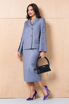 Жакет полуприлегающего силуэта, длинной ниже линии бедер.  Спинка с таллиевыми вытачками и средним швом.  Перед с нагрудными вытачками, переведенными в линии плечевого шва и накладными карманами. Жакет с центрально-бортовой застежкой на одну петлю-пуговицу и воротником пиджачного типа. Жакет на подкладке. Рукава втачные, двух-шовные, стандартной длины.