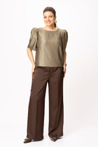Брюки классической формы, зауженные к низу, на притачном поясе. ЗП брюк с таллиевыми вытачками. ПП брюк с вытачками, боковыми карманами- хулиганами и застежкой на тесьму-молнию в среднем шве брюк. Пояс брюк со шлевками, застегивающийся на пуговицу. Сзади по поясу вставлена резинка.