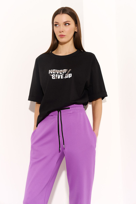Костюм женский из трикотажного полотна выполнен в двух цветах.. Футболка прямого силуэта из тонкого трикотажа. На переде выполнена печать. Горловина обработана бейкой. Рукав прямой подшит на плоскошевной машине и закрепленной подгибкой, имитирующей манжет. Низ футболки подшит на плоскошевной машине. Брюки зауженные к низу, обработаны притачной манжетой. Пояс притачной составной, с эластичной тесьмой внутри и отделочными строчками. В шве стаивания пояса обработаны "петли" для шнура. В боковых швах обработаны карманы. На задних половинках накладные карманы, на правой половинке карман с печатью.