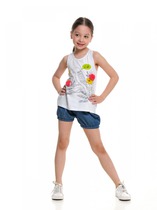 Костюм для мальчика ,состоящий из футболки и брюк. Футболка - из гладкокрашеного полотна "кулирка", классического покроя, с короткими втачными рукавами, горловиной овальной формы, обработанной втачной планкой, и принтом вцентре переда, выполненным в технике шелкографии. Брюки - из полотна с набивным рисунком, прямого силуэта, на притачном поясе с эластичнойтесьмой внутри и карманами в боковых швах, входы в которые окантованы основным материалом.