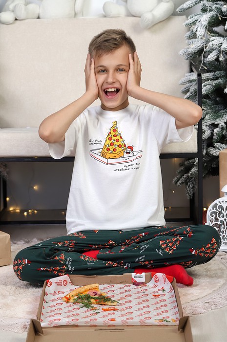 Костюм для мальчика. Футболка с принтом; модель свободная, со спущенной линией плеч. Брюки из полотна эксклюзивного дизайна, прямые, с боковыми карманами, на притачном поясе с отстроченной эластичной тесьмой.