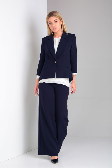 Элегантный брючный костюм в комплекте с шифоновой блузкой.Жакет полуприлегающего силуэта с воротником и лацканами классической формы, застежкой на 1 пуговицу. Особое внимание заслуживает экстравагантная спинка с имитацией запаха и серебристыми металлическими акцентами в виде  цепочек, соединяющих две половинки отлетной спинки.Брюки прямого покроя расширены от линии бедра. Комфортная посадка брюк и подчеркивающий фигуру крой сделает их любимым предметом вашего гардероба.Костюм выполнен из материала модных цветов, не требующего особого ухода, пластичен и удобен в носке.Блузка-туника нежного молочного пастельного оттенка с шифоновыми рукавами. Блуза очаровывает своим красивым непринужденным полуприлегающим силуэтом, фигурной линией низа, и конечно же спинкой.Фантазийная спинка с шифоновыми вставками и воланами, красиво драпирующимися и являющимися одним из популярных трендов, шикарно смотрится как самостоятельно, так и в сочетании с эффектным разрезом на жакете.