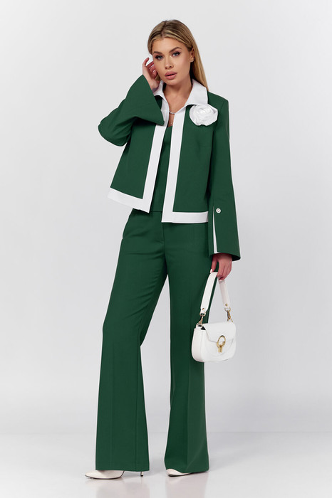 Настоящее произведение искусства!!! Уверенность, элегантность, этого костюма делает его идеальным выбором для важных деловых встреч, корпоративных мероприятий и незабываемых вечерних выходов. Изысканный комплект тройка выполнен из качественной стрейчевой ткани. Топ облегающего силуэта с рельефами по полочке, по спинке выточки и потайная молния в среднем шве. Брюки клёш от колена с за утюженым кантом, которые подчеркнут вашу утонченность и изысканность. Застежка молния по переду, по бокам прорезные карманы, пояс со шлевками и эластичной лентой по бокам. Жакет "BLAZER" без застежки на подкладке, рукав втачной расширенный к низу с декоративной шлицей. Изящность комплекту придает контрастная отделка воротника, планок, разреза шлицы и съемного декоративного цветка ручной работы подчеркнет вашу неотразимость и безупречный вкус.