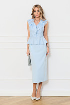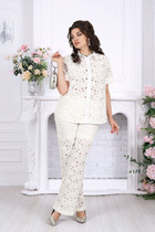 Идеальный офисный комплект состоит из сарафана и блузки. Сарафан полуприлегающего силуэта, отрезной по линии талии, на запах с поясом. Полочка с нагрудными вытачками. Спинка со средним швом. Обтачка по спинке (обработка горловины), глубокая. Блуза прямого силуэта, нежная и струящаяся, ткань стойкая к сминанию. По центру полочки застежка в виде планки на 7 петель, 7 пуговиц. Воротник стояче-отложной, рукав втачной, внизу обработан притачной манжетой. В боковых швах небольшие разрезы.