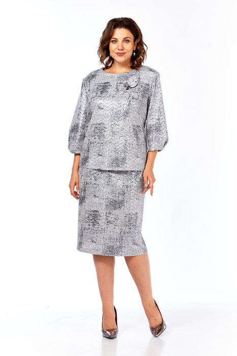 Современная фактура ткани, идеальный силуэт и нежные тона этого костюма создадут ваш незабываемый образ. В этом сезоне отдают предпочтение модели с легкими, приятными оттенками, которые добавляет смелости и решительности в образ, подходит для создания и притягательного образа. Элегантный женственный костюм состоит из блузки и юбки. Блузка полуприлегающего силуэта. По переду нагрудные вытачки. Горловина круглая, обтачная. Средний шов спинки вверху переходит в застежку на 6 навесных петель, пуговиц. Рукав втачной слегка объемный, расширенный к низу, деликатно собран в складки. Декоративным элементом является съемная дизайнерская брошь. Юбка классическая, на подкладке притачной пояс частично на резинке. На заднем полотнище застежка - потайная молния и шлица в среднем шве.