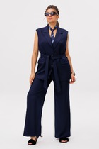 Комплект женский, состоящий из комбинезона и шазюбля. Комбинезон прямого силуэта. Вырез горловины по переду и спинке V-образный. Застежка в среднем шве спинки на потайную молнию. В боковых швах карманы. Шазюбль прямого силуэта. Состоит из трех видов ткани. Застежка на петли и пуговицы на планке. Воротник рубашечного типа. Рукав втачной, заканчивается манжетой с завязками. По спинке кокетка. Нижняя часть спинки выполнена из сетки. В боковых швах высокие разрезы и хлястики, которые помогают регулировать прилегание.